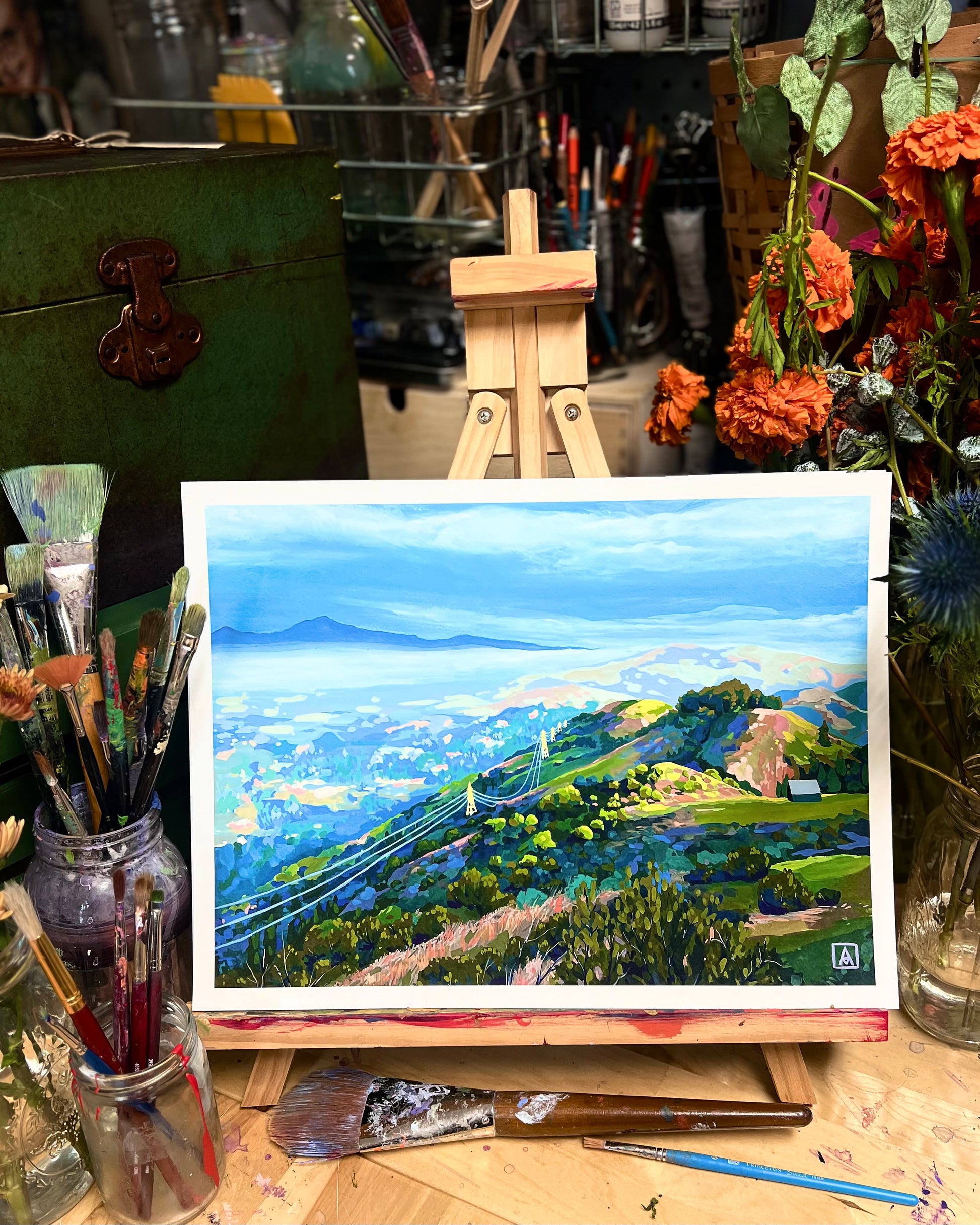 "A Pocket of Sunlight in Tilden" is a 2023 gouache painting created at the beginning of my current painting journey. Evergreen hills are spotlighted by sunshine and slight indications of humankind. The San Francisco fog rolls in, obscuring East Bay as it paints the hills blue and pink.